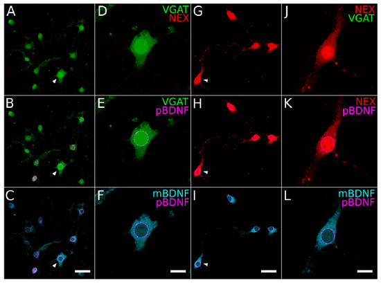 Expression of mBDNF and proBDNF in purified cortical neuron cultures. Immunostaining in (A–F) purified GABAergic ((A–C), x30 magnification; (D–F), x60 magnification) and (G–L) glutamatergic ((G–I), x30 magnification; (J–L), x60 magnification) primary cortical neuron cultures. The fluorescent signal of VGAT (green pseudocolor) and NEX (red) in both types of cultures (A,D,G,J) and overlay with proBDNF (B,E,H,K; magenta) as well as an overlay of mBDNF (cyan) and proBDNF in both populations (C,F,I,L). The arrowheads indicate the cells shown in the x60 magnifications. Note the cytoplasmic distribution of mBDNF compared to the overwhelmingly perinuclear localization of the proBDNF signal (F,L). Scale bar: (C,I), 40 µm; (F,L), 10 µm.