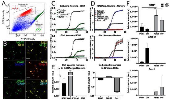 Fluorescence-activated cell sorting (FACS), immunocytochemistry and RT-qPCR from sorted cortical glutamatergic and GABAergic neuron populations. BDNF mRNA quantification from sorted and cultured cell populations: (A) Fluorescent scatter of whole neocortex cell homogenate from VGAT-YFP x NexCre-Ai9 transgenic mice with example gates used to segregate both cell populations. (B) Immunolabeling of the sorted pure cell cultures after 9 DIV with GABAergic cells on the left and glutamatergic cells on the right. The lower panels show the cell-specific neuronal markers, GAD67 and Emx1 and the glial cell marker, GFAP. (C) Exemplary curves from the RT-qPCR amplification of BDNF. (D) Specific neuronal markers, GAD67 and Emx1, for GABAergic and glutamatergic neurons. (E) Relative quantification of BDNF, GAD67, Emx1 and GFAP in GABAergic cells and BDNF, GAD67 and Emx1 in hippocampal granule cells. (F) Relative quantification results for BDNF, GAD67 and Emx1 in GABAergic and glutamatergic neurons: FACS-isolated and cultured for 7–9 DIV and FACS-isolated and pelleted cell samples (pellet). Scale bar: (B), 100 µm.