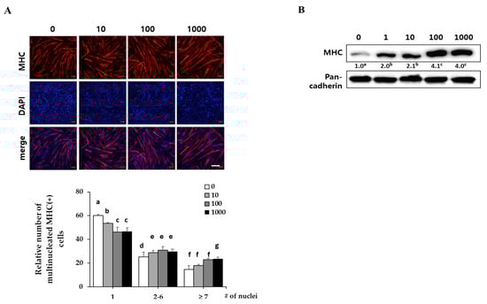 Effect of ethanol extracts of Psoralea corylifolia (EPC) on myogenesis. C2C12 cells were supplemented with differentiation medium (DM), including the indicated concentrations of EPC (1, 10, 100 and 1000 ng/mL) for 3 days, and then cells were collected to perform (A) immunostaining of MHC (red) and DAPI (blue) (scale bar = 200 µm) and (B) Western blot analysis to determine the level of myosin heavy chain (MHC) expression. The level of MHC protein was quantified and normalized to pan-cadherin. Values are mean (n = 3). The images are representative of three independent experiments with similar results. Means without a common superscript differ significantly (p < 0.05).