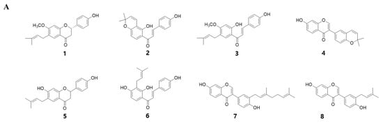 PC seeds were purchased from the Jinheung Herbal Medicine Market (Seoul, Korea) and deposited as voucher specimen (No. SPH-13003) in the Herbarium of Sookmyung Women’s University. The dried and powdered seeds were extracted with ethanol at room temperature for 24 h, and the ethanol extract was partitioned with water and ethyl acetate. The eight compounds were isolated from ethyl acetate soluble fractions, as reported previously [,,]. Their structures were elucidated by the analysis of infrared spectroscopy, mass and NMR spectroscopic data, as follows [,], bavachinin (1), isobavachromene (2), bavachalcone (3), corylin (4), bavachin (5), isobavachalcone (6), corylifol A (7) and neobavaisoflavone (8).