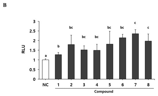 Myogenic effect of compounds 1–8 isolated from PC. (A) Structures of 1–8. (B) Transiently transfected C2C12 cells with a MyoD-responsive reporter gene were differentiated in the presence of each compound (100 nM), followed by measurement of luciferase activity. Data are expressed as mean ± S.D. of three independent experiments. RLU: relative luciferase units. NC: negative control (DMSO) and 1–8: compounds 1–8. Means without a common superscript differ significantly (p < 0.05).