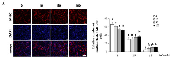C2C12 myoblasts and differentiated myotubes were fixed with 4% paraformaldehyde for 20 min and permeabilized with 0.1% Triton X-100 for 20 min in phosphate-buffered saline (PBS). After washing with PBS, cells were stained with antibody against myosin heavy chain (MHC) (MAB4470; R&D Systems, Minneapolis, MN, USA) overnight at 4 °C, followed by an Alexa Fluor 568-conjugated secondary antibody (Life Technologies, Carlsbad, CA, USA). Nuclei were counterstained with 4′-6-diamidino-2-prenylindole (Sigma-Aldrich, St. Louis, MO, USA). Immunofluorescence was observed and captured using a fluorescence microscope (Olympus, Tokyo, Japan). Red fluorescence indicates MHC expression, and blue fluorescence indicates nuclei. The MHC-positive cells were grouped according to their number of nuclei in several fields and then presented as the relative cell counts of each group.
