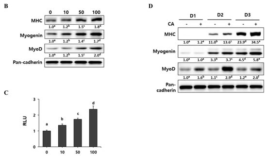 Effect of corylifol A on myogenesis. C2C12 cells were differentiated in the presence of corylifol A (CA, 10, 50 and 100 nM) for 3 days, and then cells were collected to perform (A) immunostaining of MHC (red) and DAPI (blue) (scale bar = 200 µm) and (B) Western blot analysis to determine the expression of myogenic markers. Values are mean (n = 3). (C) C2C12 myoblasts were transfected with a MyoD-responsive reporter 4RTK-luciferase, and then cells were differentiated in the presence of corylifol A, followed by measurement of luciferase activity. Data are expressed as mean ± S.D. of three independent experiments. (D) C2C12 myoblasts treated with corylifol A (100 nM) and harvested on differentiation day 1 (D1), 2 (D2) and 3 (D3) to evaluate the expression of myogenic markers. Values are mean (n = 3). The images are representative of three independent experiments with similar results. Means without a common superscript differ significantly (p < 0.05).