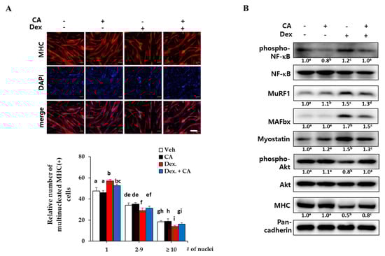 Protective effects of corylifol A against dexamethasone-induced myotube atrophy in vitro. C2C12 myoblasts were differentiated for 3 days, followed by treatment with dexamethasone (Dex, 1 µM) along with vehicle DMSO or corylifol A (CA, 100 nM) for an additional 48 h. (A) Collected cells were fixed and immunostained with MHC (red) and DAPI (blue) (scale bar = 200 µm). (B) Cell lysates were subjected to Western blot analysis to analyze phosphorylated NF-κB, E3 ligases, myostatin, phosphorylated Akt and MHC. Values are mean (n = 3). The images are representative of three independent experiments with similar results. Means without a common superscript differ significantly (p < 0.05).