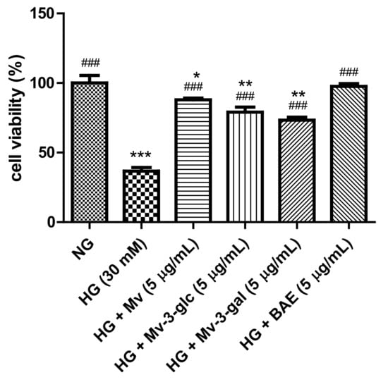 The cell viability was determined by the MTT method [59]. After pretreatment with the 5 µg/mL of Mv, Mv-3-glc, Mv-3-gal, or BAE for 24 h and continuing with 5.5 or 30 mM glucose for 24 h, the cells were added with 10 μL 0.5% (5 mg/mL) of MTT and then continued to be cultured for 4 h. After removal of the MTT solution, the cell crystal was dissolved by adding 100 μL DMSO and shaking for 10 min slowly. The absorbance of 490 nm was measured on a StatFax-2100 microplate reader (Awareness Technology Inc., Plam, FL, USA). The cells were cultured only when normal glucose (5.5 mmol/L) was used as the control group. The blank group used the wells without cells. The cell viability was determined with the following formula: