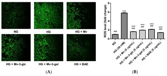 Effects of Mv, Mv-3-glc, Mv-3-gal, and BAE on reactive oxygen species (ROS) level in HUVECs exposed to high glucose for 24 h: (A) The fluorescence intensity (B) ROS fold change. A representative set of images from three independent experiments is shown. All images presented are in ×200 magnification. Bars represent mean values ± SD (n = 3). *** indicates p < 0.001 compared with the control NG; ### indicates p < 0.001 compared with the HG model.