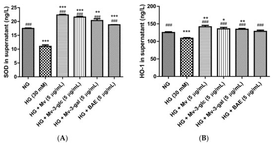 Superoxide Dismutase (SOD) and Heme Oxygenase-1 (HO-1) are enzymes that act as important endogenous antioxidant-defense systems mainly present in endothelial cells that ameliorate endothelial functions by scavenging the ROS and preventing the formation of reactive free radicals [22,23]. In the present study, SOD and HO-1 protein expression levels were high in unstimulated cells and were strongly downregulated when exposed to high glucose (p < 0.001). Pretreatment with Mv, Mv-3-glc, Mv-3-gal, and BAE could effectively upregulate the SOD and HO-1 protein expression levels (Figure 3). The SOD and HO-1 levels in Mv-, Mv-3-glc-, Mv-3-gal-, and BAE-pretreated HUVEC supernatant were 2.03 and 1.30 fold, 1.96 and 1.25 fold, 1.85 and 1.24 fold, and 1.71 and 1.18 fold that of those in HG-induced HUVEC supernatant, respectively (all p < 0.001 vs. HG group). The inhibitory rates of Mv, Mv-3-glc, Mv-3-gal, and BAE against SOD and HO-1 decrease were all above 100%, whose levels were even more than those in the control (SOD: all p < 0.001 vs. NG group; HO-1: p < 0.05 vs. NG group except BAE). Malvidin still showed a better capability to increase the downregulation of SOD and HO-1 expression levels than its derivatives Mv-3-glc and Mv-3-gal; however, BAE possessed the lowest expression levels of antioxidant enzymes SOD and HO-1 in HUVEC supernatant.
