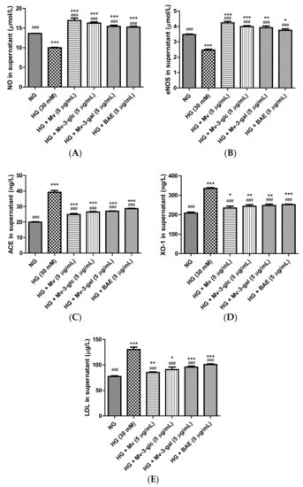 Vasodilatory effects of Mv, Mv-3-glc, Mv-3-gal, and BAE by regulating nitric oxide (NO) (A), endothelial nitric oxide synthase (eNOS) (B), angiotensin-converting enzyme (ACE) (C), xanthine oxidase-1 (XO-1) (D), and low-density lipoprotein (LDL) (E) production released into the supernatant of HUVECs exposed to high glucose for 24 h. Bars represent mean values ± SD (n = 3). *, **, and *** indicate p < 0.05, p < 0.01, and p < 0.001, respectively, compared with the control NG; ### indicates p < 0.001 compared with the HG model.