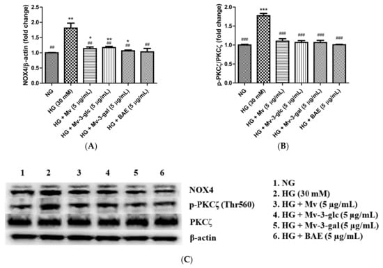 Downregulatory effects of Mv, Mv-3-glc, Mv-3-gal, and BAE on (A) NADPH oxidase isoform 4 (NOX4) and (B) p-PKCζ/PKCζ levels in HUVECs exposed to high glucose for 24 h. (C) Representative western blot bands are shown. Bars represent mean values ± SD (n = 3). *, **, and *** indicate p < 0.05, p < 0.01, and p < 0.001, respectively, compared with the control NG; ## and ### indicate p < 0.01 and p < 0.001, respectively, compared with the HG model.