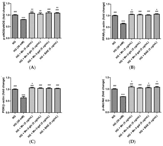 Upregulatory effects of Mv, Mv-3-glc, Mv-3-gal, and BAE on (A) p-eNOS/eNOS, (B) peroxisome proliferator-activated receptor-γ (PPARγ), (C) phosphoinositide 3-kinase (PI3K), and (D) p-Akt/Akt levels in HUVECs exposed to high glucose for 24 h. (E) Representative western blot bands are shown. Bars represent mean values ± SD (n = 3). *, **, and *** indicate p < 0.05, p < 0.01, and p < 0.001, respectively, compared with the control NG; ## and ### indicate p < 0.01 and p < 0.001, respectively, compared with the HG model.