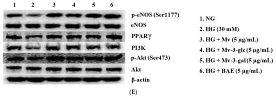 Enzyme eNOS and peroxisome proliferator-activated receptor-γ (PPARγ) agonists promote NO generation in endothelial cells, and eNOS is activated through the phosphorylation at Ser1177 [29,30]. In the present study, the effects of blueberry anthocyanins on intracellular p-eNOS/eNOS and PPARγ levels in HG-induced HUVECs were evaluated using western blotting. Similar to extracellular eNOS level in the supernatant, pretreatment with Mv, Mv-3-glc, Mv-3-gal, and BAE could restore the downregulations of active p-eNOS protein expression levels in the cells by HG stimulation. The p-eNOS/eNOS ratio significantly decreased to 0.80 ± 0.01 fold that of the control when exposed to high glucose (p < 0.001 vs. NG group), while Mv, Mv-3-glc, Mv-3-gal, and BAE increased the p-eNOS/eNOS ratios to 1.34 ± 0.03, 1.29 ± 0.07, 1.36 ± 0.07, and 1.35 ± 0.03 fold that of the HG group, respectively (Mv-3-glc: p < 0.01; the others p < 0.001 vs. HG group). Protein expression levels of PPARγ were high in unstimulated cells and were strongly downregulated when exposed to high glucose. The inhibitory rates of Mv, Mv-3-glc, Mv-3-gal, and BAE on HG-induced PPARγ decrease were also above 100%, i.e., 113.45 ± 5.75%, 109.34 ± 8.57%, 106.67 ± 4.89%, and 117.78 ± 5.61%, respectively (all p < 0.001 vs. HG group). There was no significant difference in the p-eNOS/eNOS and PPARγ change among Mv, Mv-3-glc, Mv-3-gal, and BAE groups (p > 0.05; Figure 6A,B). Representative western blot bands are shown in Figure 6E.
