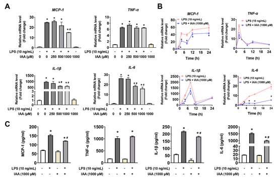Effects of IAA on LPS-induced mRNA expression and secretion of proinflammatory cytokines in RAW 264.7 cells. (A) mRNA levels relative to β-actin in cells exposed to LPS following treatment with IAA. Cells were treated with various concentrations (0, 250, 500, 1000 μM) of IAA for 12 h, and then incubated with LPS (10 ng/mL) in the presence or absence of IAA for 8 h. β-actin was considered as house-keeping gene. Results are mean ± SEM. n = 3. * p < 0.05 versus control group; # p < 0.05 versus LPS group. (B) Time-course results of relative mRNA levels of proinflammatory cytokines. Cells were pretreated with or without IAA for 12 h, followed by LPS stimulation in the present or absence of IAA for 0, 2, 4, 8, 12, and 24 h. β-actin was regarded as reference gene. Results are shown as mean ± SEM. n = 3. * p < 0.05 versus LPS group. (C) Secretion of proinflammatory cytokines were detected by ELISA at 16 h following LPS stimulation in the presence or absence of IAA after a 12 h treatment with IAA. Results shown are mean ± SEM. n = 3. * p < 0.05 versus control; # p < 0.05 versus LPS group. IAA, indole-3-acetic acid; LPS, lipopolysaccharide.