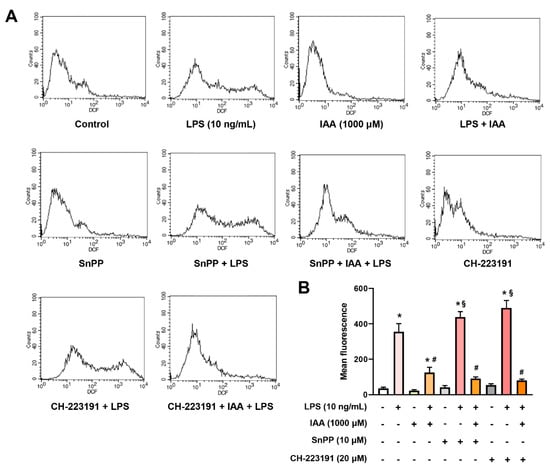 Effects of SnPP and CH-223191 on the scavenge of ROS by IAA. (A) Representative flow cytometry plots. (B) Statistical results presented by bar chart. Cells were treated with IAA (1000 μM) with or without SnPP (10 μM) or CH-223191 (20 μM) for 12 h, followed by LPS (10 ng/mL) exposure for 16 h in the presence or absence of IAA plus SnPP or CH-223191. DCFH-DA probe was added to detect the ROS level. Results are shown as mean ± SEM. n = 3. * p < 0.05 versus control group. # p < 0.05 versus LPS group. § p < 0.05 versus corresponding group without SnPP and CH-223191. DCFH-DA, 2′,7′-dichlorofluorescin diacetate; ROS, reactive oxidative species; SnPP, tin protoporphyrin IX; IAA, Indole-3-acetic acid; LPS, lipopolysaccharide.