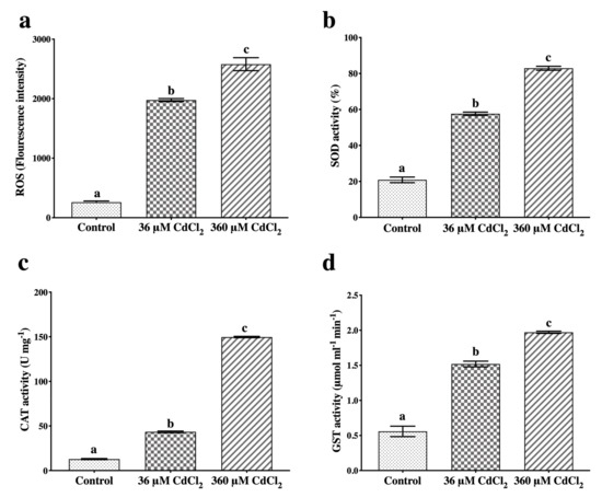 ROS amount and antioxidant/detoxifying enzyme activities in L. riparium gametophytes treated with 0 (Control), 36 or 360 μM CdCl2 for 7 days. (a) ROS production; activities of (b) superoxide dismutase, SOD; (c) catalase, CAT; (d) glutathione-S-transferase, GST. Values are mean ± SE; bars not accompanied by the same letter are significantly different at p < 0.05.