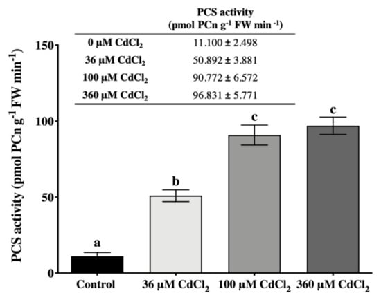 In vitro PCS activity of L. riparium gametophytes incubated with 0 (Control), 36, 100, and 360 μM CdCl2 for 90 min. Values are mean ± SE; bars not accompanied by the same letter are significantly different at p < 0.05.