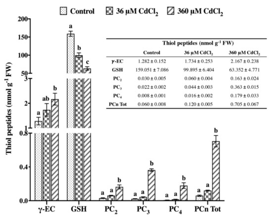 Both in control and in Cd-treated samples, the ability of L. riparium gametophytes to synthesize thiol peptides in vivo was here demonstrated; in particular, the presence of γ-EC, GSH, and PC2–4 was distinctly detected (Figure 3). The amount of PCn, although at trace levels, significantly increased only with the 360 µM CdCl2 treatment, and not with 36 µM CdCl2, as compared to controls. The highest Cd concentration led to an increased synthesis of all PCn oligomers (PC2, PC3, and PC4) (Figure 3). Differently, the GSH levels progressively decreased with the increase in Cd concentrations (Figure 3), and the γ-EC levels showed an upward trend between the controls and the 36-µM-treated samples, whereas the difference was significant between the control and the 360 µM CdCl2-treated samples (Figure 3).