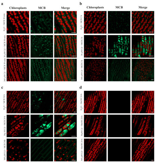 In plant cells, Cd ions are highly noxious even at low concentrations, with subsequent severe negative effects [3]. Unlike other metals, Cd does not directly induce oxidative stress [4,5] via Fenton and/or Haber-Weiss reactions [6], but rather disturbs the overall cellular redox balance and, consequently, affects the reactive oxygen species (ROS) levels [7]. In fact, Cd toxicity mainly originates from non-functional binding to various ligands that are meant to bind other divalent metals, i.e., Zn. Less known, a ligand may also be chlorophyll, where Cd2+ replaces Mg2+ as the central ion. Therefore, although not redox active, Cd exposure leads to enhanced production of ROS. Another reason is that Cd exposure reduces the capability of scavenging ROS [8]. In this regard, Cd can activate or even inhibit several antioxidant enzymes, such as superoxide dismutase (SOD; EC 1.15.1.1), which catalyzes the production of O2 and H2O2 from the radical anion superoxide (•O2–); catalase (CAT; EC 1.11.1.6), which decomposes H2O2 into O2 and H2O, and many others. Among these enzymes, the multifunctional enzyme glutathione-S-transferase (GST; EC 2.5.1.18) [9] can simultaneously counteract oxidative stress by enhancing ROS quenching, and detoxify a number of electrophilic xenobiotics or chemical elements, including Cd, both in yeast [10] and in plants [11,12,13]. Particularly, GST catalyzes an intracellular detoxification reaction of metals or noxious compounds by forming first a cytosolic conjugate between the thiol peptide glutathione (GSH) and the toxic element/substance, followed by sequestering this conjugate (GS conjugate) into the vacuolar compartment of the plant cell [14] by means of ATP binding cassette (ABC) transporters [15]. To detect xenobiotic or metal detoxification by conjugation, and the subsequent translocation of the conjugate to various compartments, the dye monochlorobimane (MCB) can be useful, because it becomes fluorescent after conjugation to GSH and, to a lesser extent, to other thiol peptides [16,17]. Time course experiments with MCB can be monitored by confocal laser scanning microscopy (CLSM).