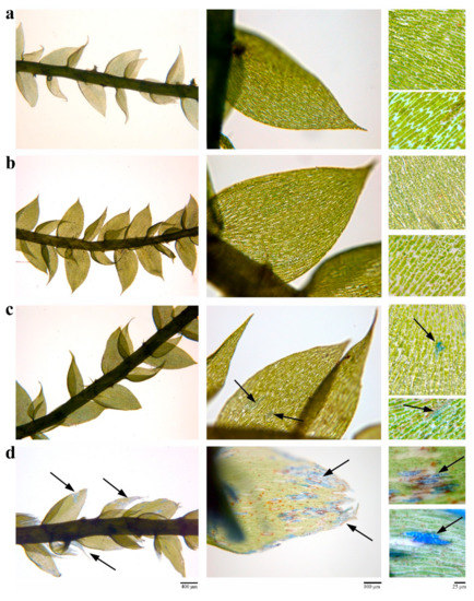 Evans Blue staining (2 h-treatment) of L. riparium gametophytes. (a) controls; (b) exposed to 36 μM Cd for 7 days; (c) exposed to 360 μM Cd for 7 days; (d) exposed to 100% ethanol for 1 h (positive controls). Arrows indicate cytohistological damage.