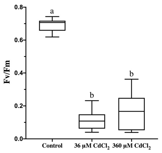 In order to evaluate the effects of Cd treatments on the photosynthetic activity in L. riparium gametophytes, the photochemical efficiency was assessed. Maximum PSII quantum yield (Fv/Fm) was negatively affected by both Cd concentrations (36 and 360 µM), compared to control (Figure 6).