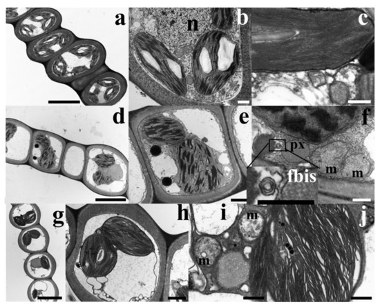 TEM micrographs of control (untreated) L. riparium gametophyte sections revealed that phylloid cells were surrounded by a thick cell wall, and contained several lenticular chloroplasts in the peripheral cytoplasm, as well as a central vacuole (Figure 7a). The well-developed thylakoids, arranged as grana and intergrana, were packed and tidily placed along the chloroplast main axis, without signs of swelling (Figure 7b,c); starch grains and rare plastoglobules were also visible (Figure 7b,c). Mitochondria had a typical morphology with cristae and an electron-dense matrix. Nuclei showed classical eu- and heterochromatin (Figure 7b). Conversely, in Cd-treated samples, some ultrastructural changes were observed that were more marked, albeit not severely, in the 360 µM Cd-treated phylloids. Samples exposed to 36 µM Cd had, in fact, a quite well-preserved ultrastructure, even though chloroplasts were slightly deformed (Figure 7d,e). The morphology of mitochondria was comparable to that of the controls (Figure 7f) and multilamellar bodies occurred in the cytoplasm (Figure 7fbis). Even more so, samples treated with 360 µM Cd had a number of ultrastructural alterations, such as plasmolyzed cells with some cytoplasm vacuolization (Figure 7g). Although grana and intergrana thylakoids were still present in the chloroplasts, a diffuse swelling was visible (Figure 7j). Mitochondria seemed altered, with swollen cristae and an electron-clear matrix. In some cells, precipitated electron-dense material was also present (Figure 7i).