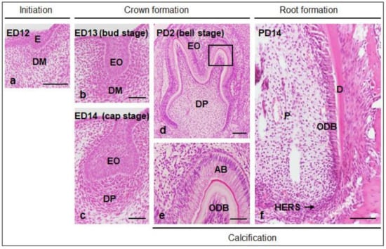 Process of molar tooth development in mouse. (a–e) Tooth development begins with thickening of the oral epithelium (E) and progresses to crown (bud, cap, and bell stages) and root formation stages. Calcification of enamel, dentin (D), and cementum occurs after the bell stage. The formation stages “initiation,” “crown formation,” and “root formation” correspond to the terms in Table 1. Higher magnification of the boxed region in “d” is shown in “e.” AB, ameloblast; DM, dental mesenchyme; DP, dental papillae; ED, embryonic day; EO, enamel organ; HERS, Hertwig’s epithelial root sheath; ODB, odontoblast; P, pulp; PD, postnatal day. Scale bars = 100 μm (a), 50 μm (b–d,f), 25 μm (e).