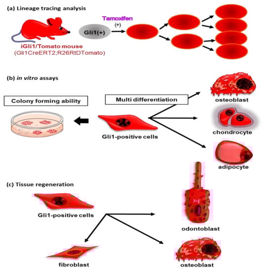 Schematic illustrations of characteristics of Gli1-positive cells in mature teeth. (a) After tamoxifen administration in iGli1/Tomato mice, Gli1-positive cells are shown to express Tomato red fluorescence. Cells that once expressed Tomato red fluorescence continuously emit this fluorescence even after cell division. Using this system, it is possible to trace the differentiation process of Gli1-positive cells and their progeny cells. (b) Gli1-positive cells exhibit high colony-forming unit fibroblast (CFU-F) activity. These cells also have trilineage potential to form osteoblasts, chondrocytes, and adipocytes in vitro. (c) After tooth transplantation into subcutaneous tissue, Gli1-positive cells differentiate into odontoblasts, osteoblasts, and fibroblasts during tissue regeneration.