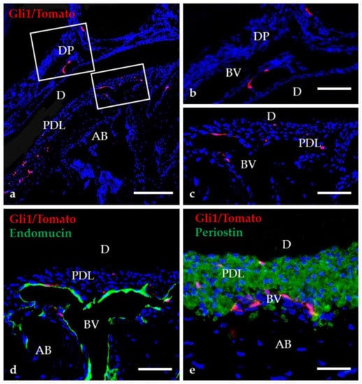 In a previous study, we revealed that Gli1-positive cells are present in the dental pulp and the periodontal ligament in mature teeth []. These cells are barely detected around the blood vessels in mature tooth (Figure 3a–e). In addition, Gli1-positive cells have been identified as mesenchymal stem cells with the ability to self-renew and with trilineage differentiation potential (Figure 2b). Although Gli1-positive cells are quiescent under normal conditions after the completion of tooth formation, they can proliferate after tissue injury, contributing to tissue repair (Figure 2c). In the following chapters, recent studies demonstrating the stem cell abilities of Gli1-positive cells during tooth development will be discussed.