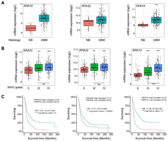 Single-stranded DNA (ssDNA) is perhaps one of the most ubiquitous and important biological intermediates formed throughout the life of cells [,]. Genomes of cells are under continous attack by exogenous and endogenous factors resulting in DNA damage, which, if left unrepaired, leads to genomic instability. RPA, a heterotrimeric ssDNA-binding protein, is required for each of the three major DNA repair pathways: nucleotide excision repair (NER), base excision repair (BER), and DSBs repair [,]. Due to its extensive involvement in safeguarding genomic stability, RPA has been shown to tightly associate with carcinogenesis. An early study aiming to identify autoantigens in breast cancer patients showed that antibodies against RPA32 can be detected prior to diagnosis []. In hepatocellular carcinoma and gastric cancer, higher RPA14 expression was found to correlate with a poor outcome [,]. Another study in bladder cancer showed that while in early stage low RPA32 levels positively correlated with patient outcome, at later stages in invasive tumors, both high RPA70 and RPA32 expression informed adverse prognosis []. Our study shows that high expression of all three RPA subunits, RPA70, RPA32 and RPA14, positively correlates with WHO malignancy stage and informs poor glioma patient survival.