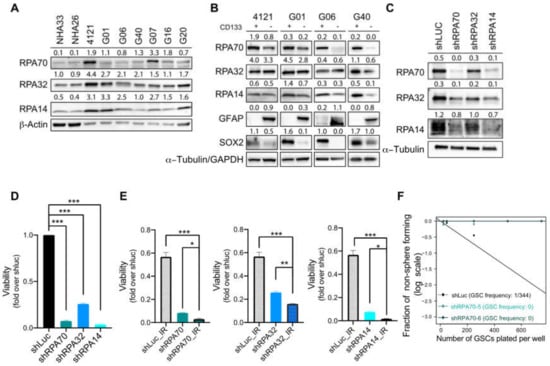 Our previous work has shown that gliomas, in general, and GSCs, in particular, exhibit high reactive oxygen species (ROS) production and with that associated high baseline of oxidative DNA damage, which leads to the accumulation of ssDNA [,,]. Since RPA coats ssDNA immediately upon its inception, we sought to investigate the RPA protein expression in patient-derived primary cell cultures passed as mouse xenografts. On immunoblot, all three RPA subunits were expressed at higher levels in our collection of primary GBM cell lines compared to normal human astrocytes (NHA33 and NHA26; Figure 2A). Next, we assessed the RPA expression in acutely dissociated and Magnetic-Activated Cell Sorting (MACS) -sorted matched-paired GSCs (CD133 positive) and differentiated GBM cells (DGCs; CD133 negative) from the 4121, G01, G06 and G40 lines, and found RPA subunits RPA70 and RPA14 were preferentially expressed by GSCs (Figure 2B). To further interrogate the role of RPA, we silenced RPA using subunit-specific lentiviral shRNAs (shRPA70, shRPA32, shRPA14) in GSCs isolated from the G01 line (further denoted as G01-GSCs). Immunoblot analysis revealed that silencing of any of the individual subunits negatively impacts the expression of the other two remaining subunits (Figure 2C), suggesting that targeting of just one of the subunits is sufficient for abrogating the overall function of total RPA. Lentivirus-mediated knockdown of RPA subunits impaired the viability of G01-GSCs as measured by CellTiter-Glo luminiscence cell viability assay (Figure 2D). Most importantly, RPA silencing sensitized G01-GSCs to IR (Figure 2E) and reduced their capacity to self-renew (Figure 2F), thereby supporting our hypothesis that RPA mediates the radio-resistant phenotype of this aggressive cell population and supported the notion that a successful eradication of RPA function may impair their capacity to evade radio-therapy.