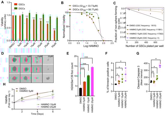 To assess the impact of RPA inhibition on DSB formation using microscopy-based assay, we have scored γH2AX foci accumulation after treating G01-GSCs with increasing concentrations of HAMNO (Figure 3E). RPA inhibition in this experiment resulted in a dose-dependent accumulation of DSBs, a phenomenon that correlated with an increased death of G01-GSCs by apoptosis as assessed by annexin V and cleaved caspase-3 staining (Figure 3F–G). While 5 μM HAMNO induced significant damage, apoptosis and negatively impacted the sphere formation, only concentrations of 10 and 20 μM caused a significant decrease int G01-GSCs’ viability measured by CellTiterGlo luminiscent assay over a perior of six days (Figure 3H).