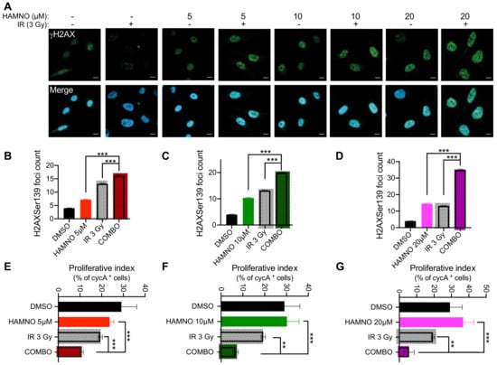 HAMNO treatment induces DNA damage and activates cell cycle checkpoints in glioblastoma cancer stem-like cells. (A) Representative confocal microscopy images of γH2AX foci in G01-GSCs treated for 24 h with a vehicle control (DMSO) or increasing doses of HAMNO—5, 10 and 20 μM; then irradiated (COMBO) or sham-irradiated and incubated for an additional 24 h. (B–D) Microscopy-based quantification of γH2AX foci in G01-GSCs treated for 24 h with a vehicle control (DMSO) or increasing doses of HAMNO—5, 10 and 20 μM; then irradiated (COMBO) or sham-irradiated and incubated for additional 24 h. (E–G) Microscopy-based quantification of a proliferative index (% of nuclear cyclin A-positive cells) in G01-GSCs treated for 24 h with a vehicle control (DMSO) or increasing doses of HAMNO—5, 10 and 20 μM; then irradiated (COMBO) or sham-irradiated and incubated for additional 24 h. Data are presented as mean ± SD. Statistical significance was tested using one-way ANOVA, where ** p < 0.01, *** p < 0.001. N = 3.