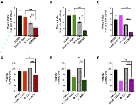 HAMNO treatment lowers the mitotic index and sensitizes glioblastoma cancer stem-like cells to ionizing radiation. (A–B) Microscopy-based quantification of a mitotic index (% of cells in mitosis) in G01-GSCs treated for 24 h with a vehicle control (DMSO) or increasing doses of HAMNO—5, 10 and 20 μM; then irradiated (COMBO) or sham-irradiated and incubated for additional 24 h. Data are presented as mean ± SD. Statistical significance was tested using one-way ANOVA test, where * p < 0.05, ** p < 0.01, *** p < 0.001; ns = not significant. N = 3. (D–E) CellTiter-Glo luminescent viability assay (Promega) of G01-GSCs treated for 24 h with a vehicle control (DMSO) or increasing doses of HAMNO—5, 10 and 20 μM; then irradiated (COMBO) or sham-irradiated and incubated for additional 48 h. Data are presented as mean ± SD. Statistical significance was tested using a two-way ANOVA with post-hoc Sidak’s multiple comparisons test, where * p < 0.01, ** p < 0.01, *** p < 0.001. ns = not significant. N = 3.