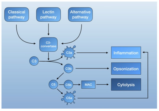 The complement system is mainly activated by three pathways: the lectin pathway, the classical pathway, and the alternative pathway. Each is triggered by different agents, which converge in the formation of C3 convertase. C3 convertase then cleaves C3 into C3b, a potent opsonin, and C3a, an anaphylatoxin [62]. Further propagation of C3b also results in the generation of C5 convertase, which cleaves C5 to C5a, an anaphylatoxin capable of recruiting inflammatory mediator cells, and C5b. C5b then forms a complex with other complement proteins that make up the MAC. The deposition of the MAC on cell membranes leads to calcium influx and cell lysis but can also activate intracellular signaling at lower doses [62] (Figure 1).