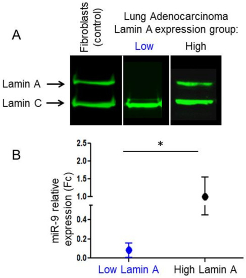 Thus, in this context, miR-9 could be a good candidate to explain the reduction of lamin A expression, as miR-9 seems to be a central actor in the carcinogenesis and the metastatic process of NSCLC, and it also specifically targets prelamin A mRNA, inhibiting the expression of lamin A but not of lamin C.