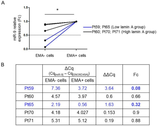miR-9 expression in carcinoma cells according to lamin A expression, after FACS isolation. (A) miR-9 relative expression (Fc = fold change) quantified by RT-qPCR analysis according to the EMA expression, reflecting lamin A expression (p = 0.03, Paired Wilcoxon test). *: p < 0.05 (B) miR-9 relative expression and fold change (Fc) of EMA− cells compared to EMA+ cells in 2 patients from the ‘Low lamin A expression’ group (Pt59 and 65, in blue) and in 3 patients from the ‘High lamin A expression’ group (Pt60, 70 and 71, in black).
