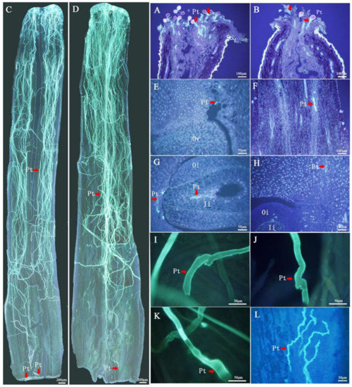 Pollen tube growth from 2 h to 72 h in the pistil after self- and cross-pollination in Camellia oleifera. (A) Pollen grain germination on stigma at 2 h after cross-pollination (CP) (100×). (B) Pollen grain germination on stigma at 2 h after self-pollination (SP) (100×). (C) Pollen tube growth to the base of the style at 48 h after CP (40×). (D) Pollen tube growth to the base of the style at 48 h after SP (40×). (E) Pollen tube growth to the upper part of ovary at 48 h after CP (200×). (F) Pollen tube growth to ovary at 48 h after SP (100×). (G) Pollen tube growth to ovule at 72 h after CP (200×). (H) Pollen tube growth to ovary at 72 h after SP (100×). (I–K) Abnormally shaped pollen tubes at the base of style after SP. (L) Abnormally shaped pollen tube at the upper part of ovary after SP. Pt = pollen tube, Es = embryo sac, Oi = outer integument and Ii = inner integument.
