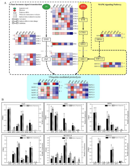 Metabolic pathways involved in self-incompatibility of Camellia oleifera. (A) Expression levels of each transcript in self-, cross- and non-pollinated pistils and mature pollen were shown by heatmap using log10(FPKM). FPKM = fragments per kilobase per million mapped fragments. The dotted line represents plant hormone signal transduction, the yellow background represents the plant MAPK signaling pathway and the blue background represents the ubiquitin-mediated proteolysis. The rectangles marked with green frames represent transcripts with significant differences in SP48_VS_CP48 or SP72_VS_CP72 by Duncan’s test. SP48/72, self-pollinated pistils at 48 h/72 h; CP48/72, cross-pollinated pistils at 48 h/72 h; NP48/72, non-pollinated pistils at 48 h/72 h and Pn, mature pollen. COI1: coronatine insensitive 1 (COI1.1: cb10019_c10797/f1p1/2331, COI1.2: cb10019_c12051/f3p2/2439, COI1.3: cb10019_c213631/f7p3/2189 and COI1.4: cb10019_c24162/f1p1/2313); JAZ: jasmonate ZIM-domain protein (JAZ10.1: cb10082_c1/f6p0/1155, JAZ10.2: cb10082_c9/f1p0/2636, JAZ2: cb15491_c52/f1p1/1212, JAZ3.1: cb15491_c53/f1p0/995 and JAZ3.2: cb15491_c77/f2p0/1218); ETR: ethylene receptor (ETR2.1: cb17705_c11/f2p0/917, ETR2.2: cb17705_c23/f1p0/3523, ETR2.3: cb17705_c46/f1p0/2261, ETR2.4: cb17705_c49/f1p1/3042, ETR2.5: cb17705_c50/f1p0/3281, ETR3: cb2257_c41/f1p0/1264, ETR4: cb2257_c48/f1p0/5354, ETR1.1: cb2257_c52/f6p0/3288 and ETR1.2: cb5372_c7/f2p0/2692); CTR1: serine/threonine-protein kinase 1 (CTR1: cb13260_c20799/f1p0/1502); EIN2:ethylene-insensitive protein 2 (EIN2: cb18338_c4/f1p0/1901); EIN3: EIN3-like protein (EIN3.4: cb16581_c3/f1p0/1238, EIN3.1.1: cb3510_c25/f3p0/1874, EIN3.2: cb3510_c34/f1p0/2313, EIN3.1.2: cb3510_c58/f2p0/1728 and EIN3.1.3: cb3510_c60/f1p1/1582); XRN4: 5′-3′ exoribonuclease 4 (XRN4: cb10019_c84410/f1p0/2840); EBF1/2: EIN3-binding F-box protein (EBF1/2.1: cb2074_c31/f2p0/2581 and EBF1/2.2: cb2074_c97/f4p3/2739); SIAH1: E3 ubiquitin-protein ligase SIAH1 (SIAH1: cb3579_c35/f1p0/1059); RCHY1: RING finger and CHY zinc finger domain-containing protein 1 (RCHY1.1: cb10019_c30957/f9p2/3704, RCHY1.2: cb10019_c40423/f1p0/2236, RCHY1.3: cb10019_c49228/f3p1/2088, RCHY1.4: cb10019_c49752/f1p0/2425 and RCHY1.5: cb15316_c3/f2p0/1121) and TRIP12: E3 ubiquitin-protein ligase UPL4 (TRIP12.1: cb10019_c108175/f3p0/2352, TRIP12.2: cb10019_c2620/f4p1/3672, TRIP12.3: cb10019_c2623/f1p0/2608, TRIP12.4: cb16096_c25/f4p0/1881, TRIP12.5: cb16096_c9/f1p0/1267 and TRIP12.7: cb19931_c8/f2p0/2614). The numbers behind the transcript name represent the transcript ID in the transcriptome. (B) Expression levels of JAZ2, EIN2, XRN4, SIAH1, RCHY1.4 and TRIP12.2 based on FPKM and qRT-PCR data. SP48 sample was the reference to calculate the relative expression data. Error bars indicate SD. Different letters represent significant difference at mRNA levels (p < 0.05).