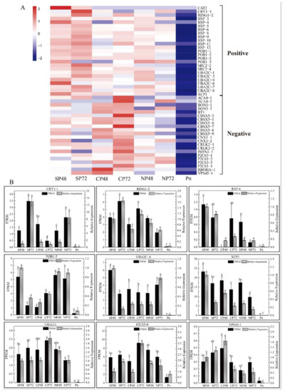 Cytological observation showed that C. oleifera pollen tube growth inhibition (Figure 1) after self-pollination is PCD-related [33]. Twenty putative PCD-related genes (10 positive and 10 negative) from literatures [46,47,48,49,50,51] were identified. In Table S5, we can find that 73 PCD-related transcripts were expressed in mature pollen at lower levels than those in self-, cross- and non-pollinated pistils. Forty-seven transcripts showed significant differences in SP and CP by Duncan’s test (Figure 5A). Most of the positive genes exhibited relatively high levels of expression in self-pollinated pistils, such as catalase isozyme 2 (CAT2), cryptochrome-1 (CRY1), E3 ubiquitin-protein ligase (RING1), CO(2)-response secreted protease (RSP) and UBP1-associated protein 2C (UBA2C). Relatively, the expression levels of negative genes were lower after self-pollination and higher in cross- or non-pollinated pistils, such as alpha carbonic anhydrase 4 (ACA4), BONZAI 3 (BON3), CBS domain-containing protein (CBSX5) and respiratory burst oxidase homolog protein A (RBOHA). The qRT-PCR analysis of nine transcripts revealed consistent expression patterns with those generated by RNA-seq data (Figure 5B). These expression patterns suggested that the products of these PCD-related genes could have important roles in the inhibition of pollen tube growth of C. oleifera.