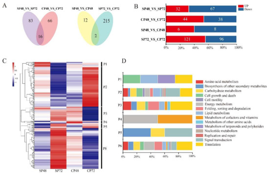 Differentially expressed proteins (DEPs) analysis of C. oleifera after self- and cross-pollination. (A) Venn diagrams of DEPs in self- and cross-pollinated pistils at 48 and 72 hours. SP48/72, self-pollinated pistils at 48 h/72 h and CP48/72, cross-pollinated pistils at 48 h/72 h. (B) Numbers of DEPs in self- and cross-pollinated pistils. (C) Hierarchical clustering analysis of 295 DEPs after self- and cross-pollination of C. oleifera. DEPs clustered into six groups (P1–P6). (D) Stacked bar chart of classification of KEGG pathway in six groups. The X-axis represents the proportion of each class in the corresponding cluster.