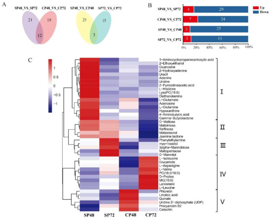 Differentially expressed metabolites (DEMs) analysis of C. oleifera after self- and cross-pollination. (A) Venn diagrams of DEMs in self- and cross-pollinated pistils at 48 and 72 h. (B) Numbers of DEMs in self- and cross-pollinated pistils. (C) Hierarchical clustering analysis of DEMs after self- and cross-pollination of C. oleifera. SP48/72, self-pollinated pistils at 48 h/72 h and CP48/72, cross-pollinated pistils at 48 h/72 h.