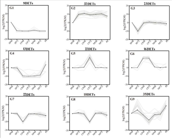After total RNA was extracted, eukaryotic mRNA was enriched by Oligo [87] beads, while prokaryotic mRNA was enriched by removing rRNA using Ribo-ZeroTM Magnetic Kit (Epicentre, New York, NY, USA city, state abbrev., country). RNA was sequenced using Illumina HiSeqTM2500 by Gene De novo Biotechnology Co (Wuhan, China) [88]. The rRNA-removed reads of each sample were then mapped to redundancy isoform from ISO-seq by TopHat (version 2.0.3.12) [89]. To identify DETs with a fold change ≥ 2 and a false discovery rate (FDR) < 0.01 of 8 sample pairs (SP48_vs_SP72, CP48_vs_CP72, SP48_vs_CP48, SP72_vs_CP72, SP48_vs_NP48, CP48_vs_NP48, SP72_vs_NP72 and CP72_vs_NP72), the DESeq2 package of the R Project was used [90].