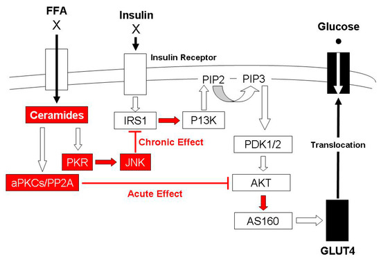 Schematic representation of the deleterious influence of elevated intramuscular ceramide concentration on two different steps of the insulin signal transduction pathway. The acute effect involves ceramide-induced inhibition of protein kinase B (Akt) via protein phosphatase 2 (PP2A) or atypical protein kinase Cs (aPKCs) while a chronic effect occurs due to activation of the protein kinase R (PKR) stress pathway which negatively impacts insulin receptor substrate 1 (IRS1) [8].