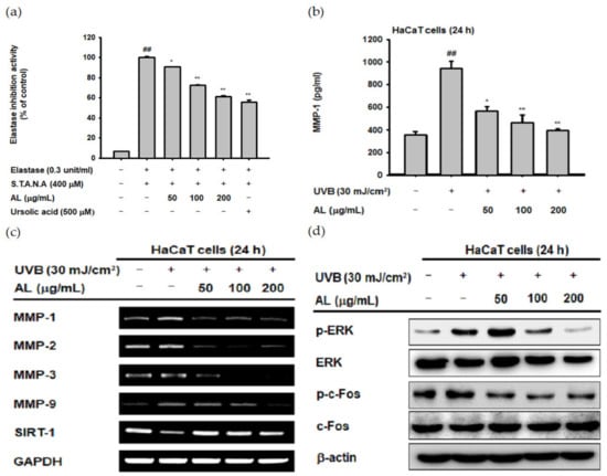 2.2. Antiwrinkle Effects of AL through Activation of the AP-1 Signaling Pathway in HaCaT Cells