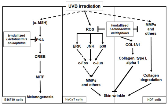 - Im, A.; Lee, B.; Kang, D.J.; Chae, S. Protective effects of tyndallized Lactobacillus acidophilus IDCC 3302 against UVB-induced photodamage to epidermal keratinocytes cells. Int. J. Mol. Med. 2019, 43, 2499–2506. [Google Scholar] [CrossRef]