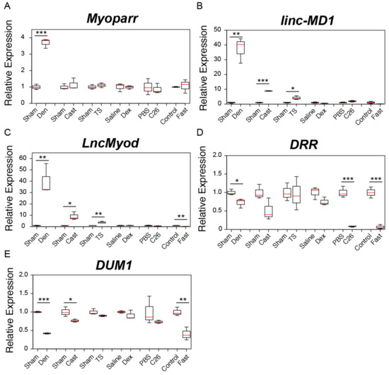 Changes in the expression of skeletal muscle differentiation-related lncRNAs in six muscle atrophy conditions. (A–E) Box-and-whisker plots showing the results of quantitative RT-PCR (qRT-PCR) for Myoparr (A), linc-MD1 (B), LncMyod (C), DRR (D), and DUM (E) expression in multiple muscle atrophy models. Red lines indicate the median values. Lower and upper box limits are 25th and 75th percentiles, respectively. Whiskers indicate the maximum and minimum values. Sham; tibialis anterior (TA) muscles of sham-operated C57BL/6J mice. Den; denervated TA muscles of C57BL/6J mice. Cast; casting-operated TA muscles of C57BL/6J mice. TS; TA muscles of tail suspension-operated C57BL/6J mice. Saline; TA muscles of saline-injected C57BL/6J mice. Dex; TA muscles of dexamethasone-injected C57BL/6J mice. PBS; TA muscles of control phosphate-buffered saline (PBS)-injected CD2F1 mice. C26; TA muscles of C26 tumor-bearing CD2F1 mice. Control; TA muscles of C57BL/6J mice provided with water and food ad libitum. Fast; TA muscles of fasting C57BL/6J mice. qRT-PCR data were normalized to Rpl26 expression and shown as relative expression. n = 3 per group. * p < 0.05. ** p < 0.01. *** p < 0.001.