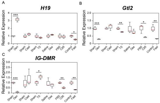Changes in the expression of genomic imprinting-related lncRNAs in six muscle atrophy conditions. (A–C) Box-and-whisker plots showing the results of quantitative RT-PCR (qRT-PCR) for H19 (A), Gtl2 (B) and IG-DMR (C) expression in multiple muscle atrophy models. Sham; tibialis anterior (TA) muscles of sham-operated C57BL/6J mice. Den; denervated TA muscles of C57BL/6J mice. Cast; casting-operated TA muscles of C57BL/6J mice. TS; TA muscles of tail suspension-operated C57BL/6J mice. Saline; TA muscles of saline-injected C57BL/6J mice. Dex; TA muscles of dexamethasone-injected C57BL/6J mice. PBS; TA muscles of control phosphate-buffered saline (PBS)-injected CD2F1 mice. C26; TA muscles of C26 tumor-bearing CD2F1 mice. Control; TA muscles of C57BL/6J mice provided with water and food ad libitum. Fast; TA muscles of fasting C57BL/6J mice. qRT-PCR data were normalized to Rpl26 expression and shown as relative expression. n = 3 per group. * p < 0.05. ** p < 0.01. *** p < 0.001.