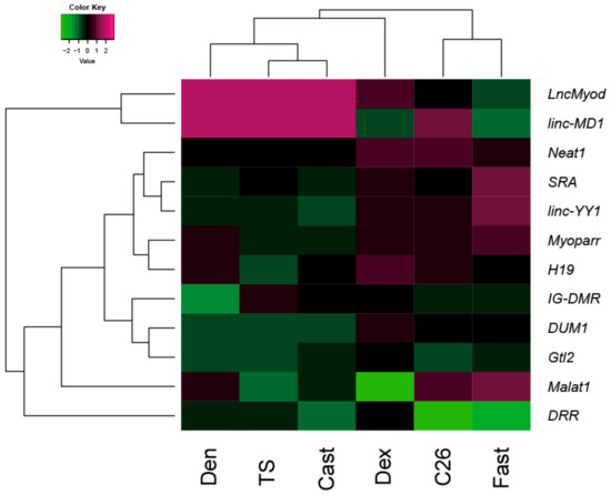 Cluster analysis of the expression profiling of lncRNAs in muscle atrophy conditions. The result of the cluster analysis of the expression profile of lncRNAs in muscle atrophy is shown as a heatmap (values are z-scores). Den; denervation treatment. TS; tail suspension treatment. Cast; casting treatment. Dex; dexamethasone administration. C26; cancer cachexia. Fast; fasting treatment.