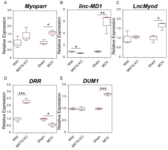 Changes in the expression levels of skeletal muscle differentiation-related lncRNAs in skeletal muscle hypertrophy conditions. (A–E) Box-and-whisker plots showing the results of quantitative RT-PCR (qRT-PCR) for Myoparr (A), linc-MD1 (B), LncMyod (C), DRR (D), and DUM1 (E) expression in two muscle hypertrophy conditions. Wild; tibialis anterior (TA) muscles of control C57BL/6J mice. MSTN KO; TA muscles of C57BL/6J-background myostatin knockout mice. Sham; plantaris muscles of sham-operated C57BL/6J mice. MOV; plantaris muscles of mechanical overload (MOV)-operated C57BL/6J mice. qRT-PCR data were normalized to Rpl26 expression and shown as relative expression. n = 3 per group. * p < 0.05. ** p < 0.01. *** p < 0.001.