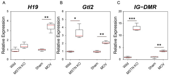 We next examined the expression of three genomic imprinting-related lncRNAs (H19, Gtl2, and IG-DMR) in the muscle hypertrophy condition. The expression level of H19 was significantly increased by the MOV treatment but not by the myostatin deficiency (Figure 5A). In accordance with the results of our previous study [36], myostatin deficiency significantly increased the expression levels of Gtl2 and IG-DMR (Figure 5B,C). As well as in the case of myostatin deficiency, significant increases in the expression levels of Gtl2 and IG-DMR were also observed after the MOV treatment (Figure 5B,C).