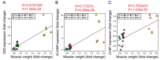 The expression levels of Gtl2, IG-DMR, and DUM1 show a positive correlation with skeletal muscle weight. (A–C) Pearson correlation plot with a coefficient of correlation (R) and p-value (P) between skeletal muscle weight (fold-change with respect to control) and Gtl2 (A), IG-DMR (B), and DUM1 (C) expression (fold-change with respect to control) in multiple muscle atrophy and hypertrophy models. Each dot indicates the independent samples (n = 3 per group). Dots with white, blue, red, green, light blue, purple, yellow, and orange indicate the denervated tibialis anterior (TA) muscles of C57BL/6J mice (Den), the casting-operated TA muscles of C57BL/6J mice (Cast), the TA muscles of tail suspension-operated C57BL/6J mice (TS), the TA muscles of dexamethasone-injected C57BL/6J mice (Dex), the TA muscles of C26 tumor-bearing CD2F1 mice (C26), the TA muscles of fasting C57BL/6J mice (Fast), the TA muscles of C57BL/6J-background myostatin knockout mice (KO), and the plantaris muscles of mechanical overload (MOV)-operated C57BL/6J mice (MOV), respectively.